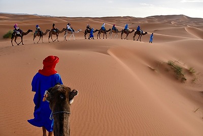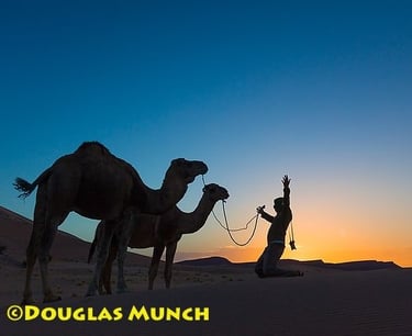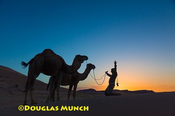 This photo taken at sunrise in the Sahara Desert, Morocco. Photographer Massimo attempts to implore our dromedaries to move forward for our day's journey. They did not appear they were listening!